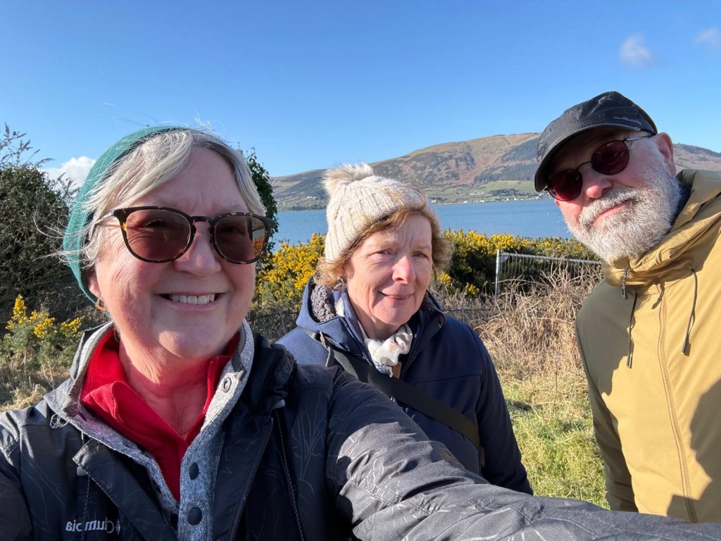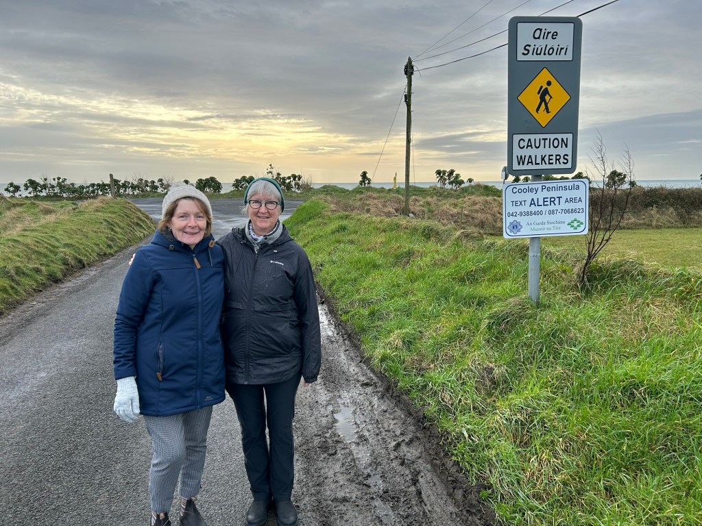 Cooley Mountains and Carlingford Lough in the background. Happy walkers on the Greenway up front.